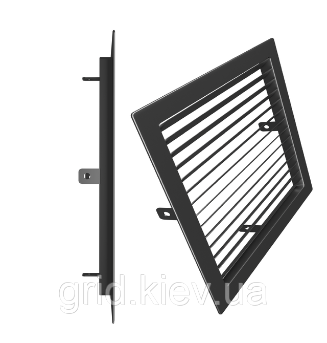 Виготовлена з металу, конструкція цільно зварена. Рама решітки виготовлена з кутника, та заповнена жалюзями зі смуги. Решітка має монтажні внутрішні вуха – чотири штуки. Основна комплектація відображена на малюнку.